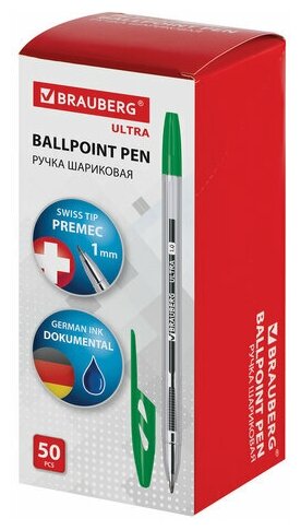 Ручка шариковая BRAUBERG "ULTRA", зеленая, узел 1 мм, чернила германия, наконечник швейцария, 143561, 50шт в компл.