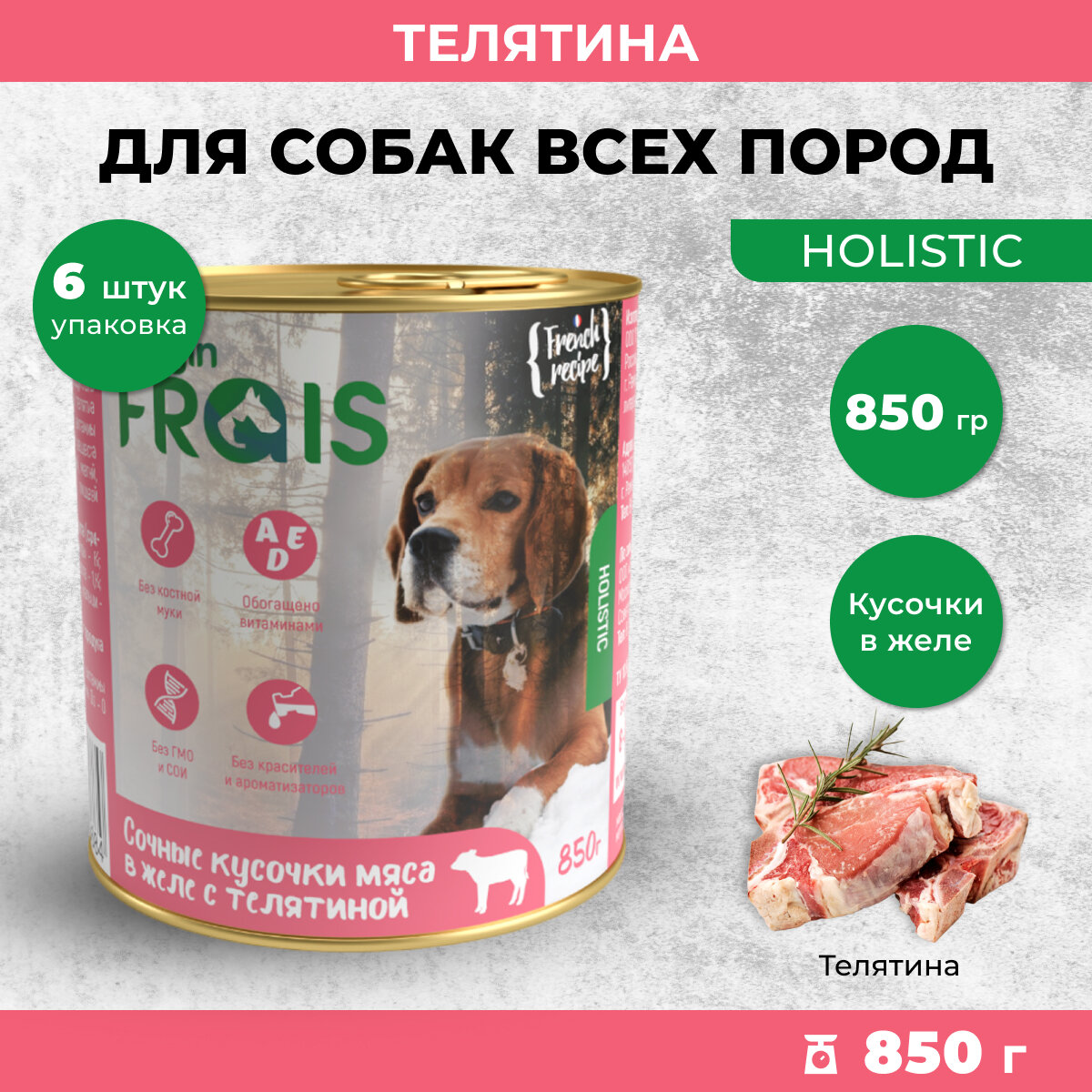 Купить Влажный корм для собак Frais Holistic сочные кусочки мяса в желе с телятиной, 850 гр х 6 шт