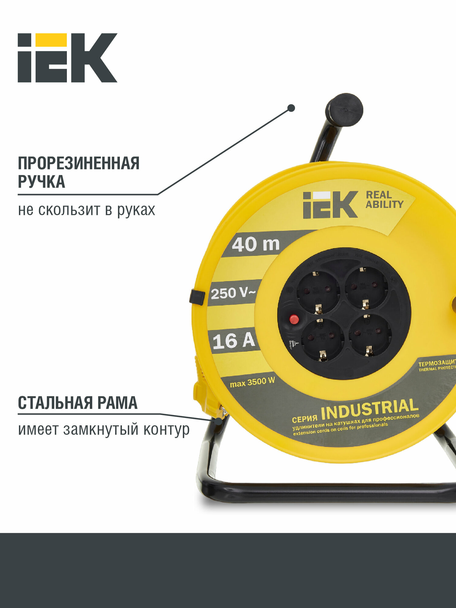 Удлинитель на катушке IEK Industrial УК40, 4 розетки, с т/з, с заземлением, 3 x 1,5 мм², 40 м