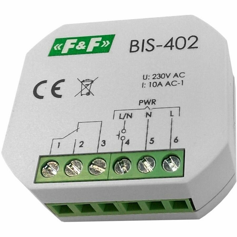 Реле бистабильное F&F BIS-402, максимальный ток нагрузки 8 А. В монтажную коробку.