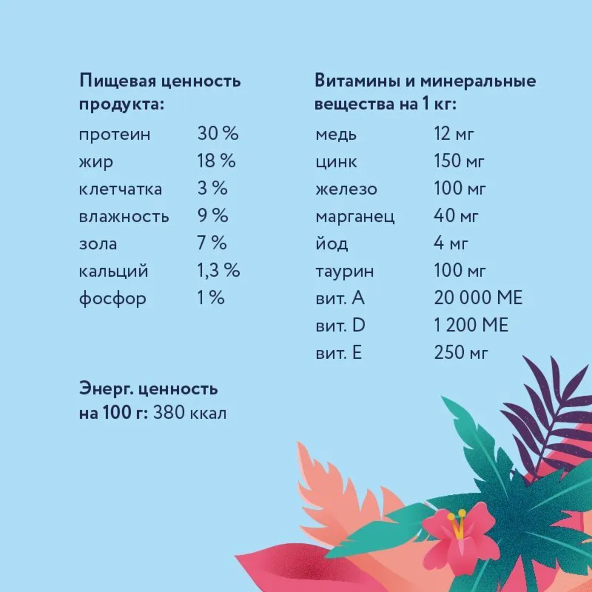 | Минеральные вещества | Цинк 150 мг/кг, железо 100 мг/кг, марганец 40 мг/кг, йод 4 мг/кг, таурин 100 мг/кг. |
