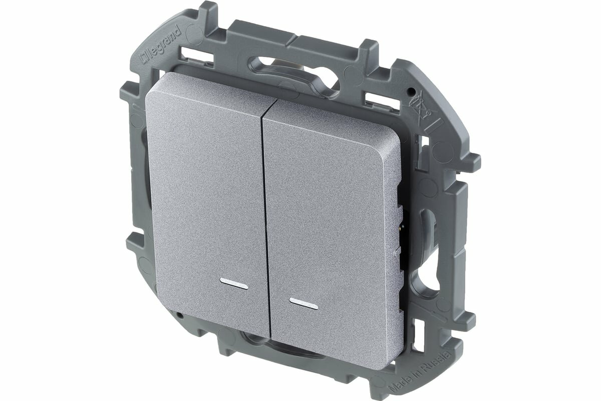Выключатель 2-х клавишный с подсветкой Legrand Inspiria для скрытого монтажа, цвет - алюминий