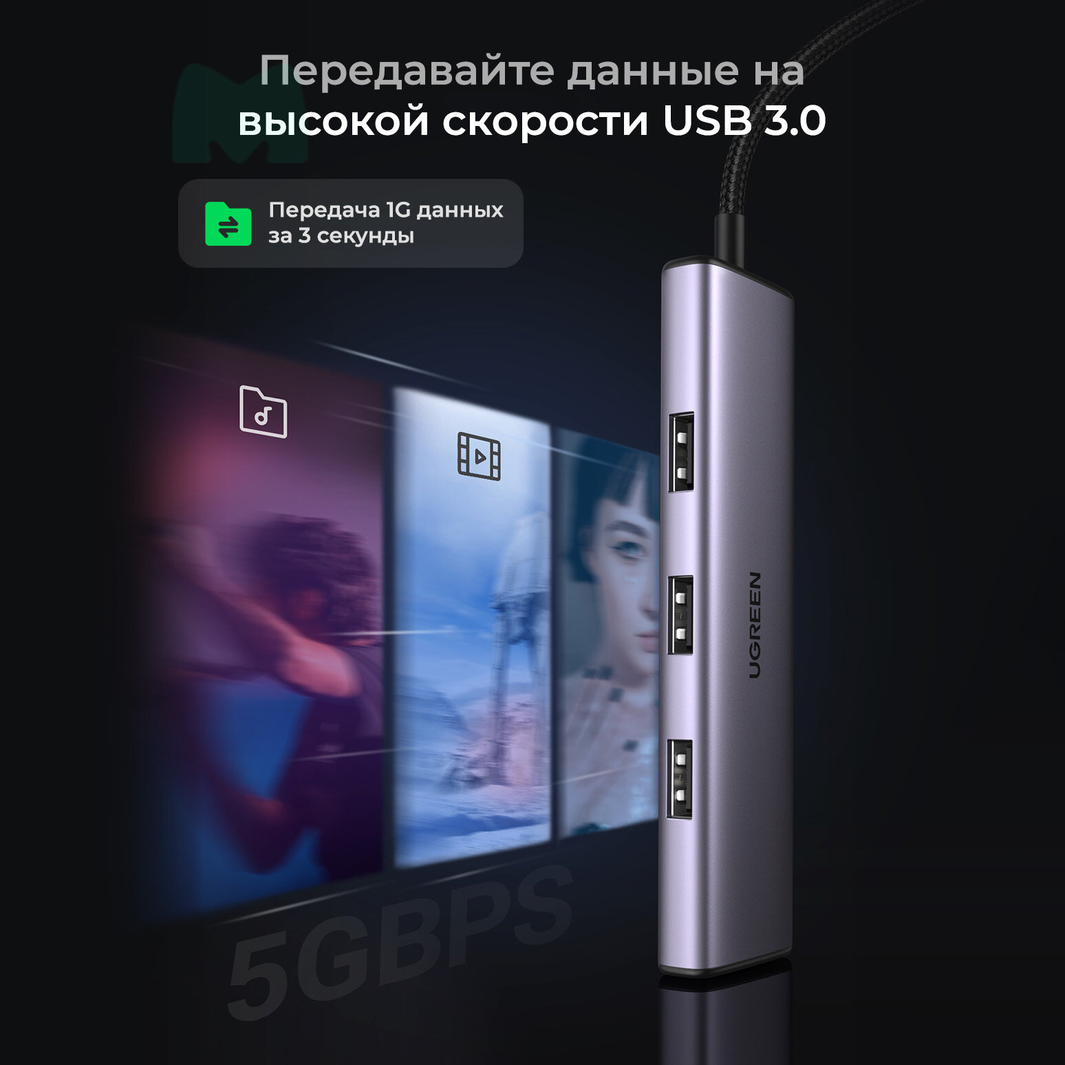 СохранитьХаб USB-C 4 в 1 UGREEN CM473 / 4xUSB-A 3.0, цвет серый космос (20841) интересное:
