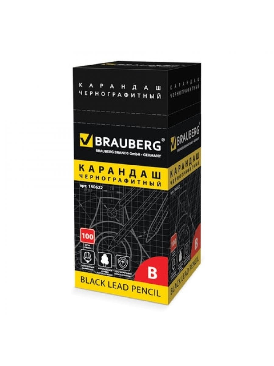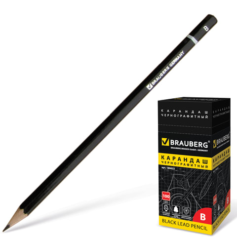 Карандаш чернографитный BRAUBERG, 1 шт., "Touch line", В, корпус черный, заточенный, 180622, 100 штук, 180622