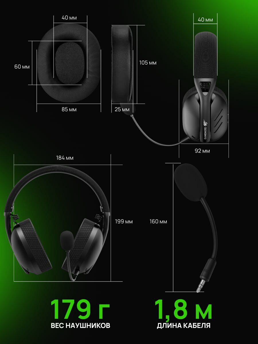 Наушники игровые проводные / Гарнитура с микрофоном для ПК, компьютера, ноутбука Havit H2002E чёрный/зелёный 3.5 jack