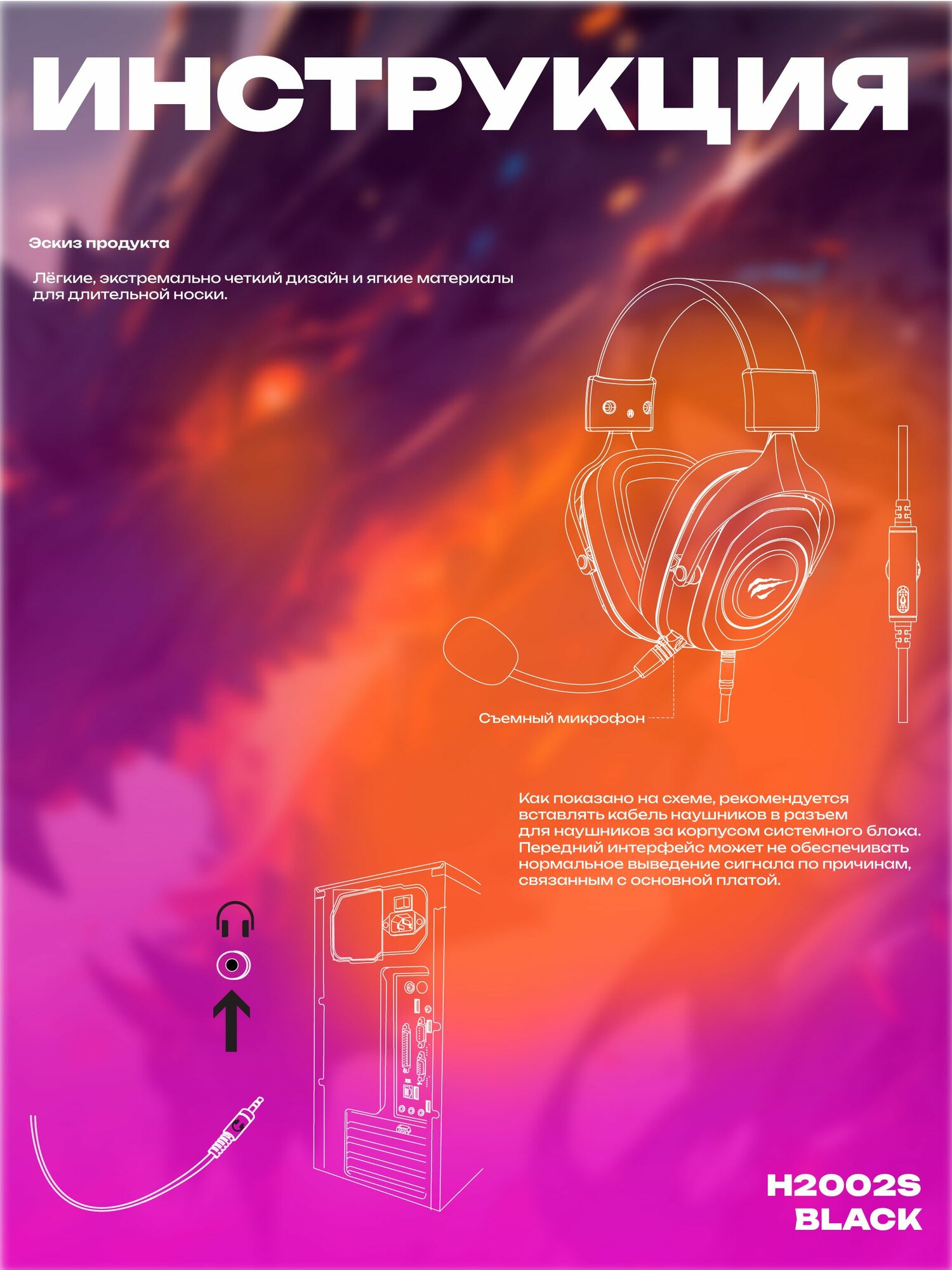 Компьютерная гарнитура Havit H2002D, 3.5 мм, черный, съемный микрофон