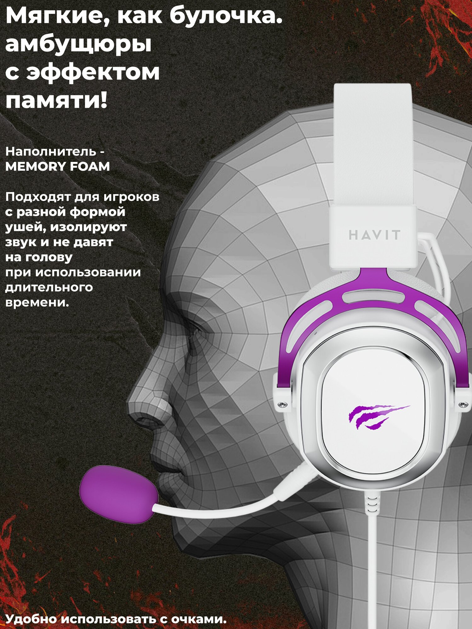 Купить Наушники игровые, геймерские, проводные с микрофоном Havit H2008d белый/фиолетовый 3.5 jack