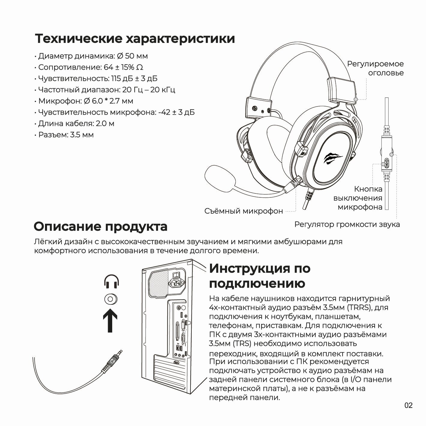 Компьютерная гарнитура Havit H2002D, 3.5 мм, черный, съемный микрофон
