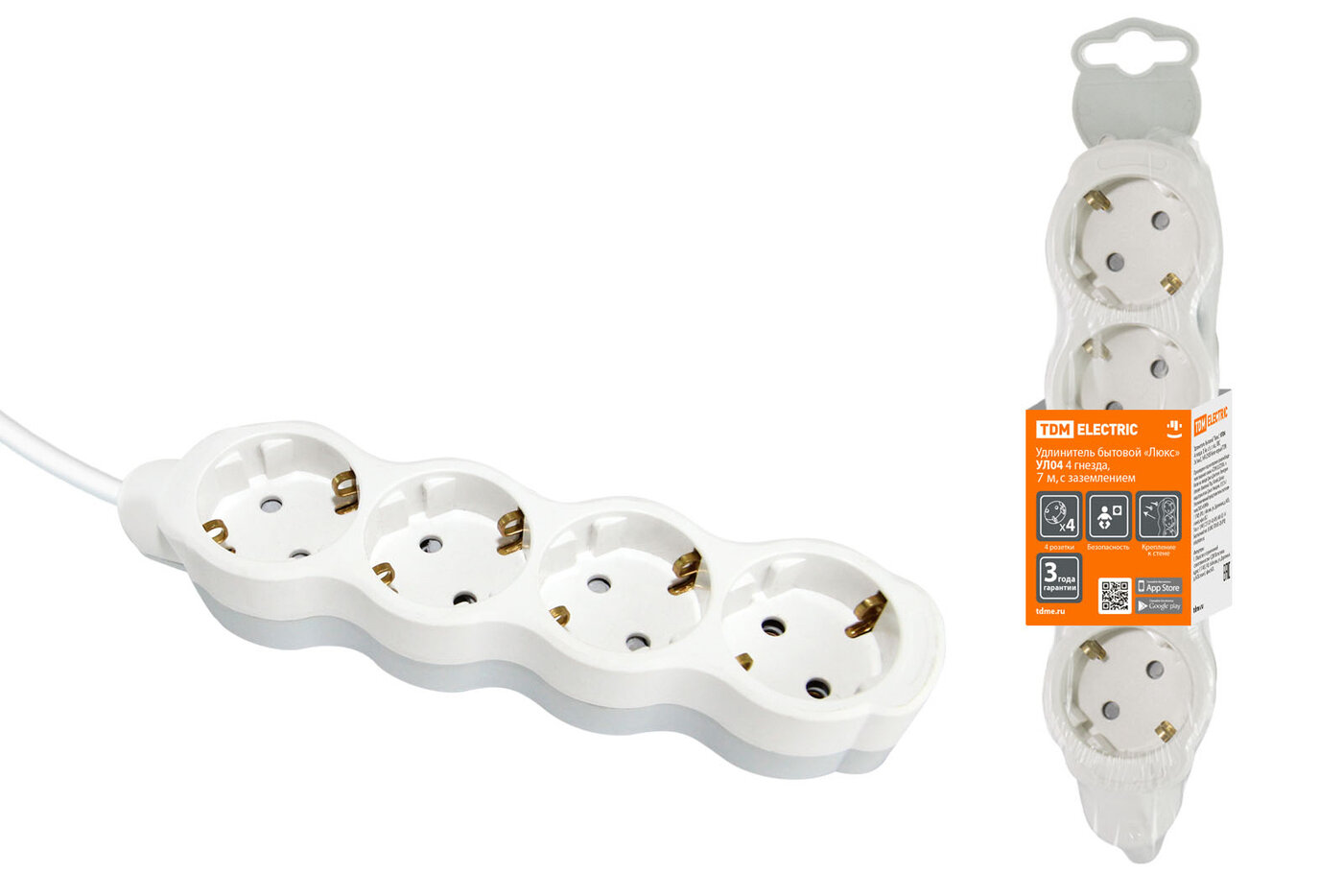 TDM SQ1303-0283 Удлинитель бытовой "Люкс" УЛ04 4 гнезда, 7м, с/з, с з/ш, ПВС 3х1мм2 16А/250В бело-се .