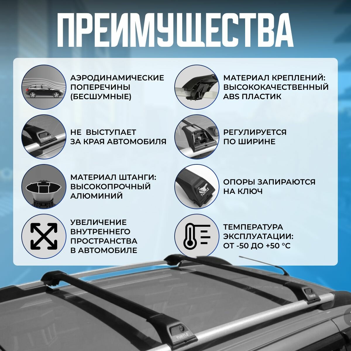 Ниже Вы можете прочитать отзывы на Багажник Turtle Tourmaline V1 на рейлинги с просветом (Аэродинамические поперечины с замком), ознакомится с подробными характеристиками, посмотреть интересные обзоры и фотографии на Багажник Turtle Tourmaline V1 на рейлинги с просветом (Аэродинамические поперечины с замком).