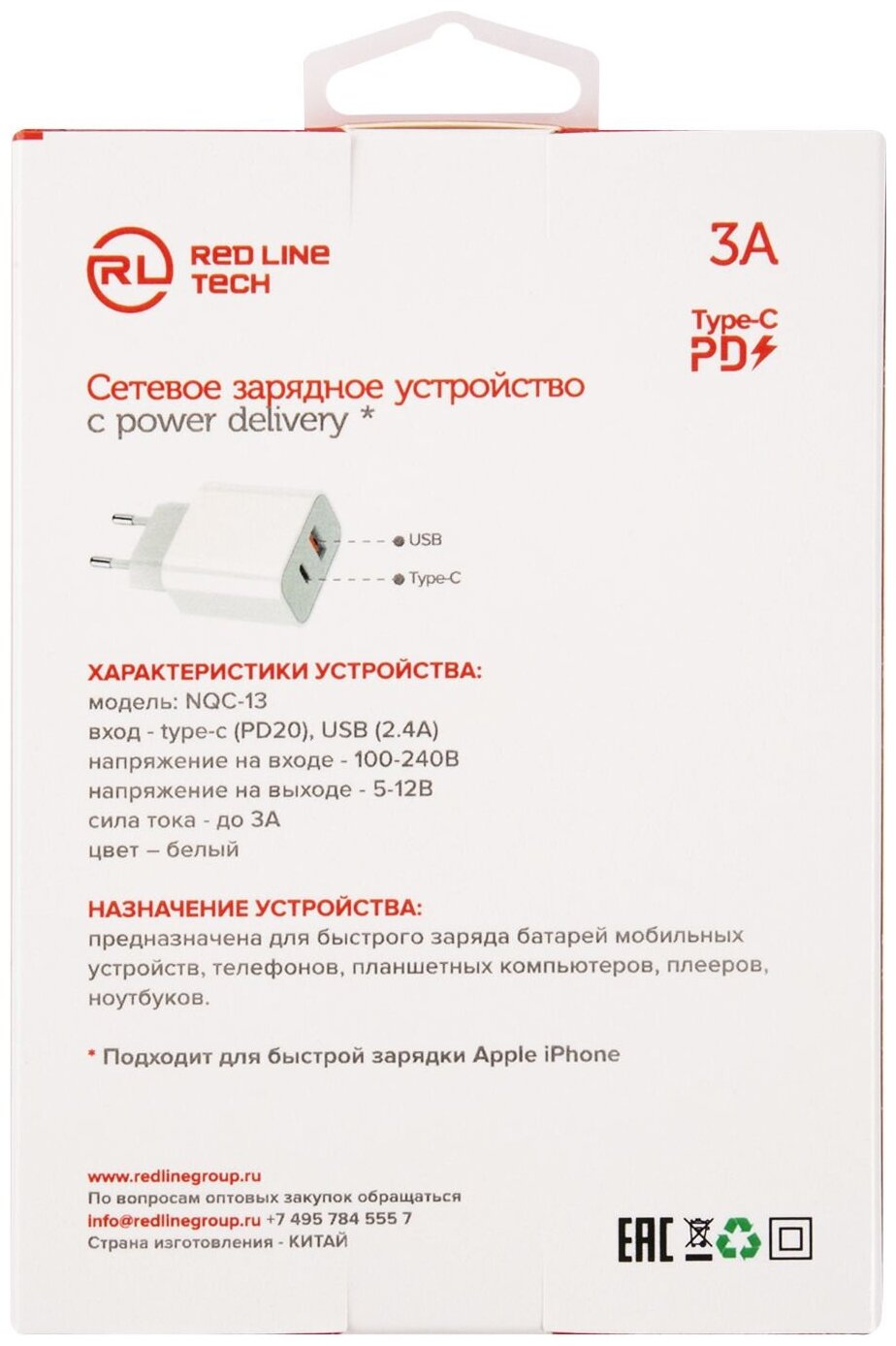 Зарядное устройство сетевое Red Line, USB+Type-C,3A, PD 20W, бел, УТ000024925 интересное: