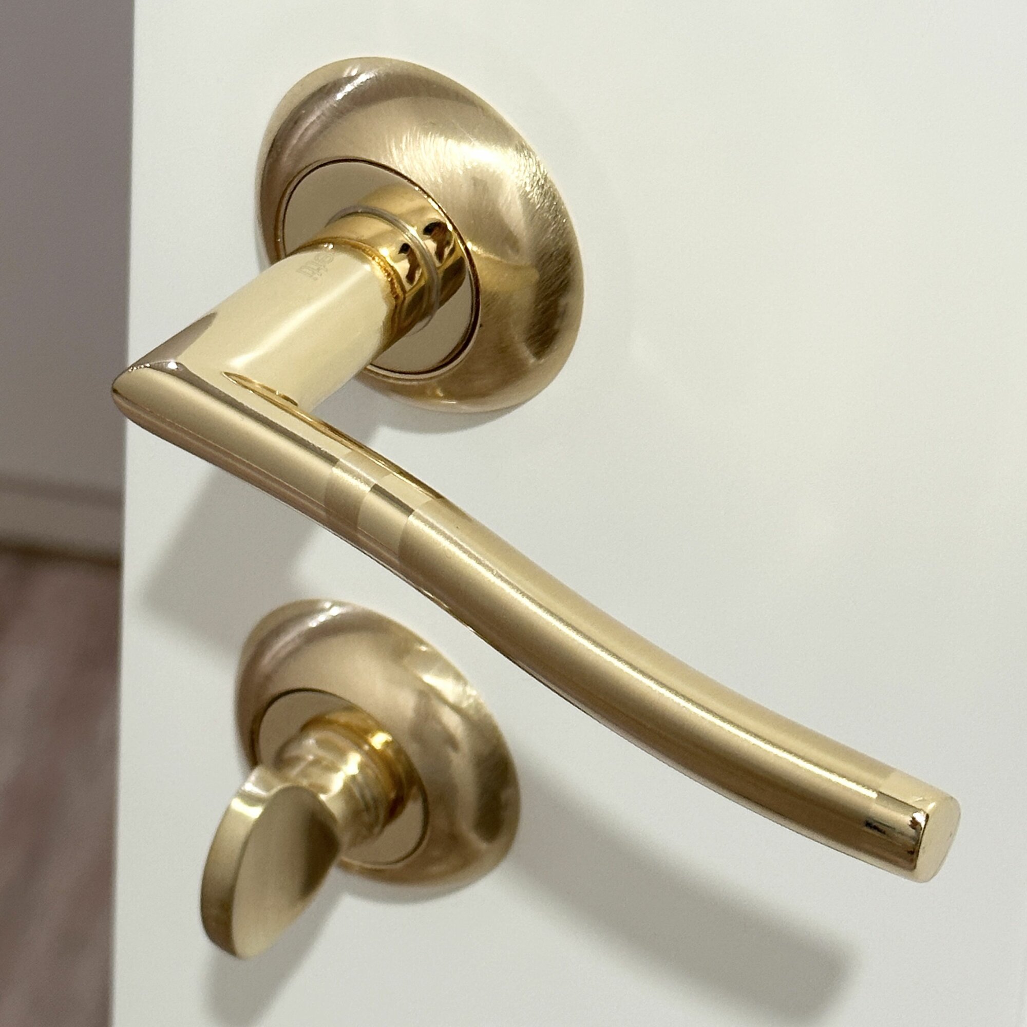 Купить Дверная ручка Rucetti (Ручетти) RAP 3 SG/GP + Межкомнатный замок Morelli (Морелли) 1895P PG + Сантехническая завертка RAP WC SG/GP / Межкомнатные дверные ручки с замком и фиксатором