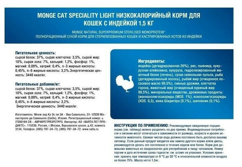 СохранитьКорм Monge "Speciality Line Light", для кошек, сухой, низкокалорийный, индейка, 1.5кг интересное: