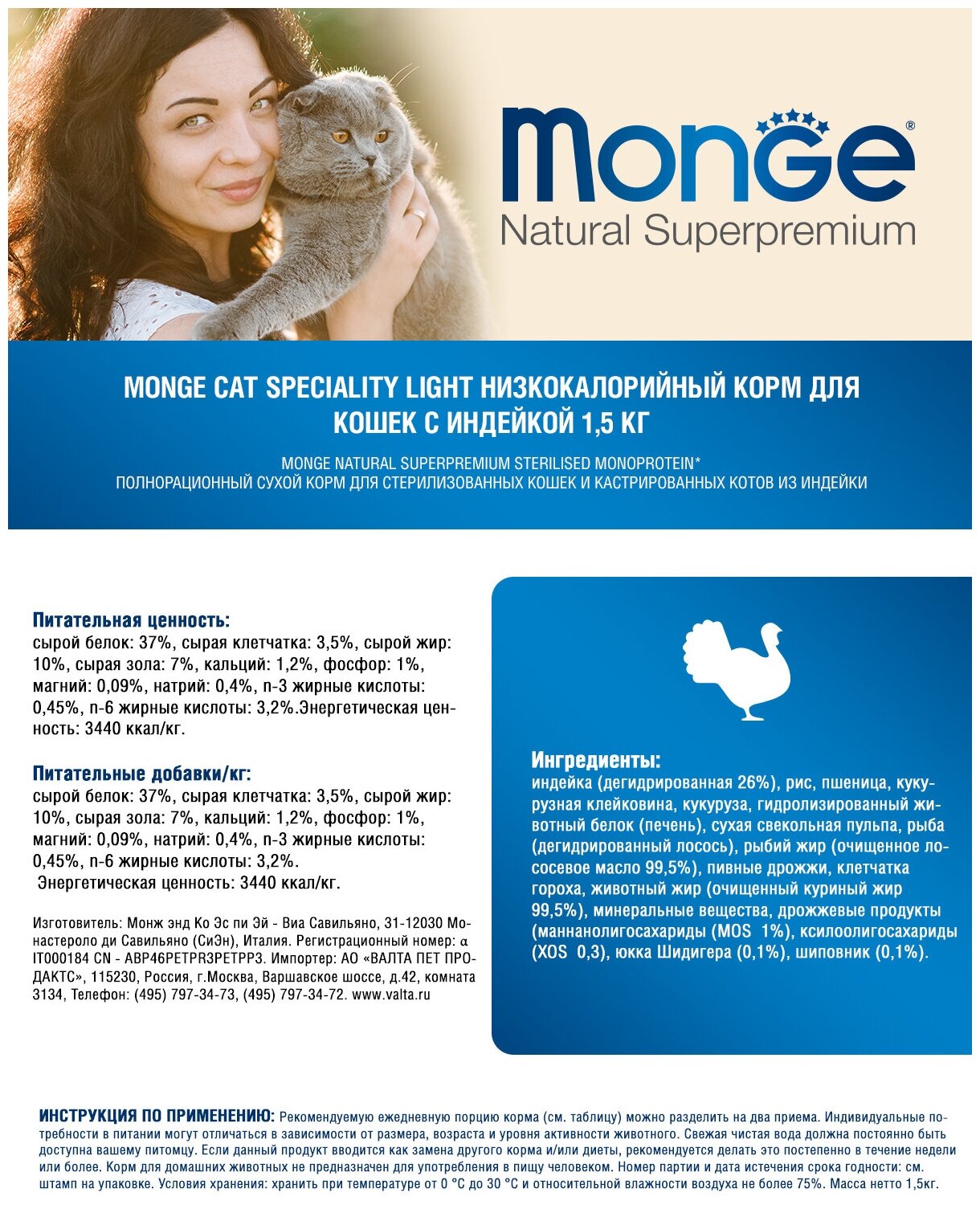 Сухой корм Монж для взрослых кошек Низкокалорийный Индейка 1,5 кг