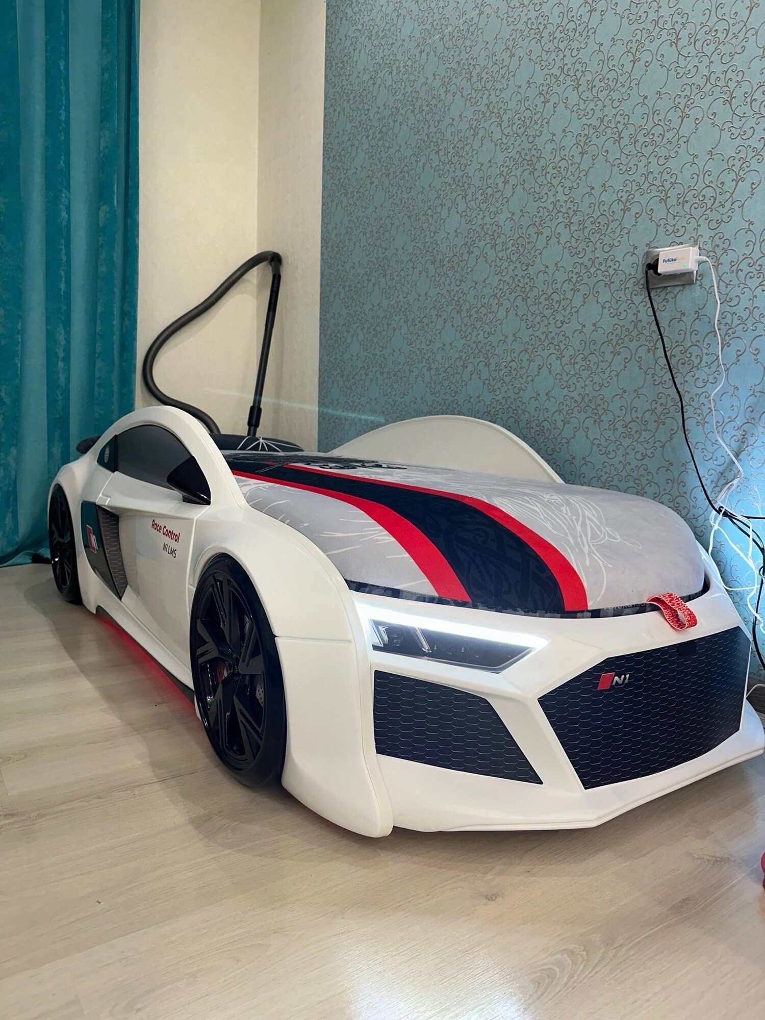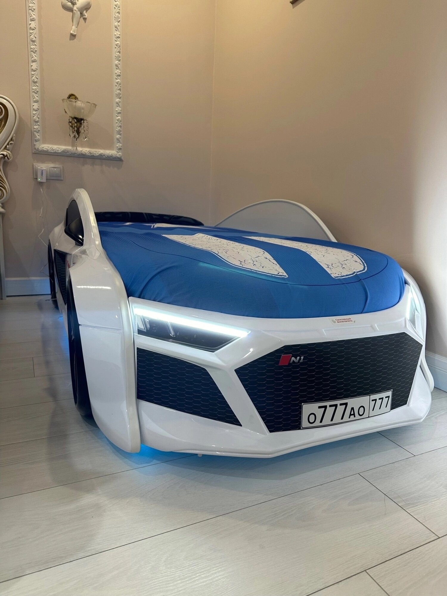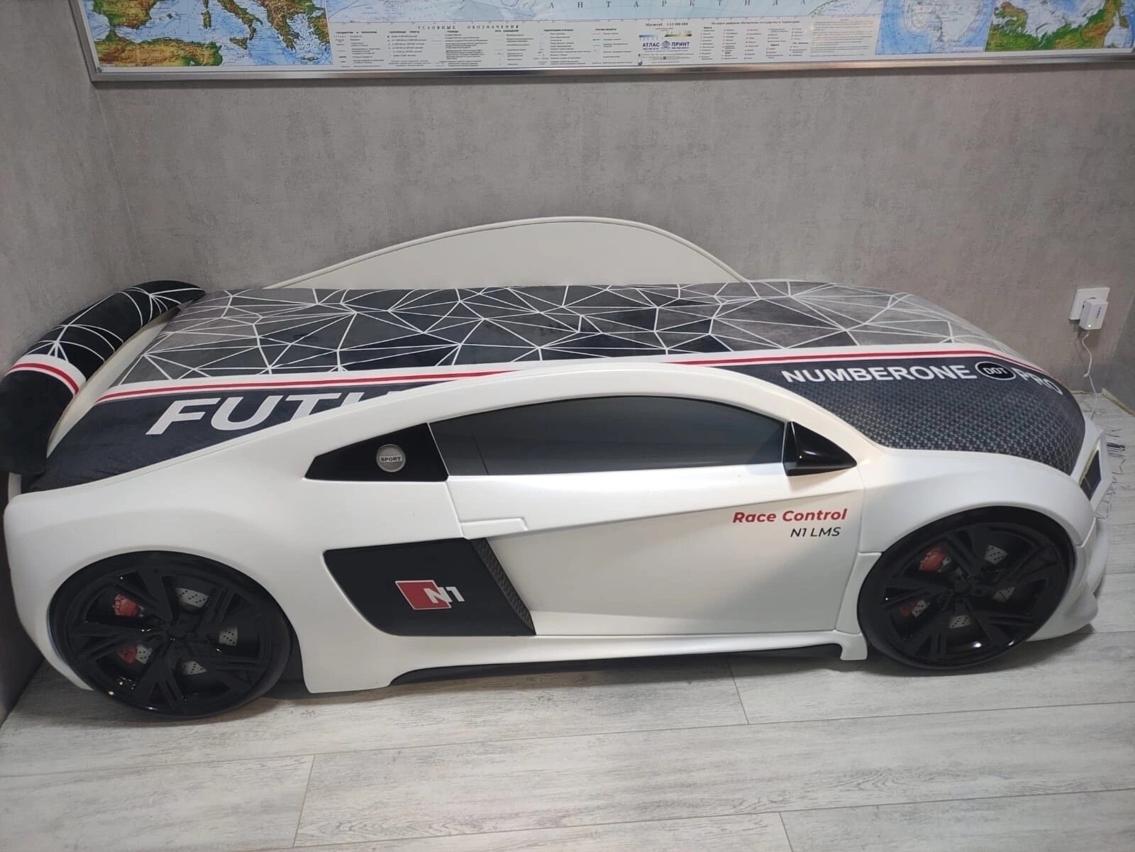 Futuka Kids кровать-машина N1 AUDI со встроенным матрасом, спойлером и подсветкой фар и дна, цвет белый, 80х180 см. интересное: