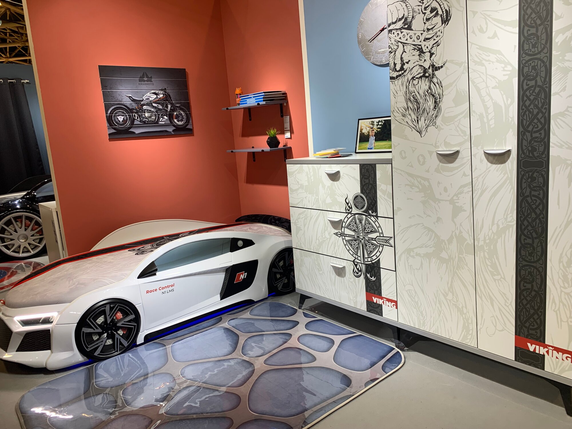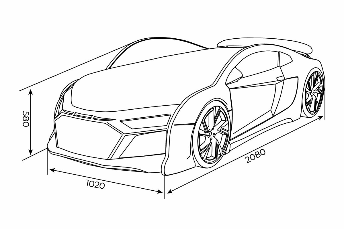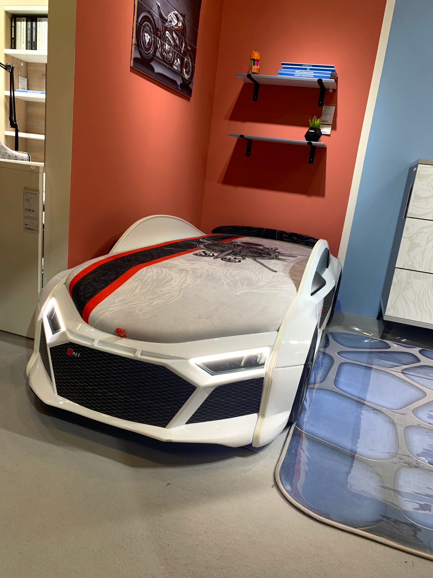 Кровать машина с матрасом N1 AUDI (Белый, Подъемный механизм, плюс ящики, Без подсветки фар, Без подсветки дна, SPORT 3D)