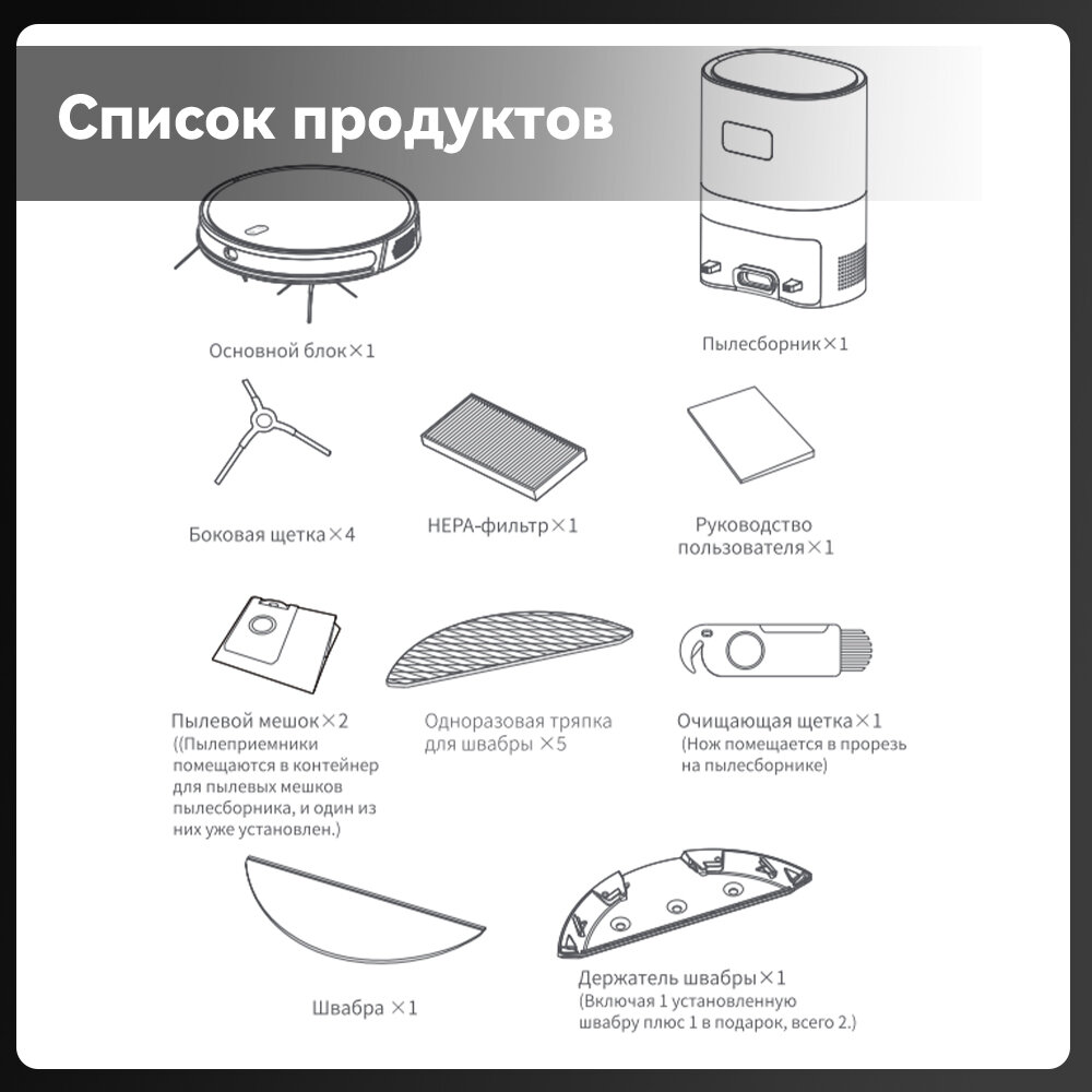 | Особенности конструкции | гироскоп / датчик перепада высоты / индикатор заполнения пылесборника / лидар / мусоросборник в базе / мягкий бампер / подсветка дисплея |