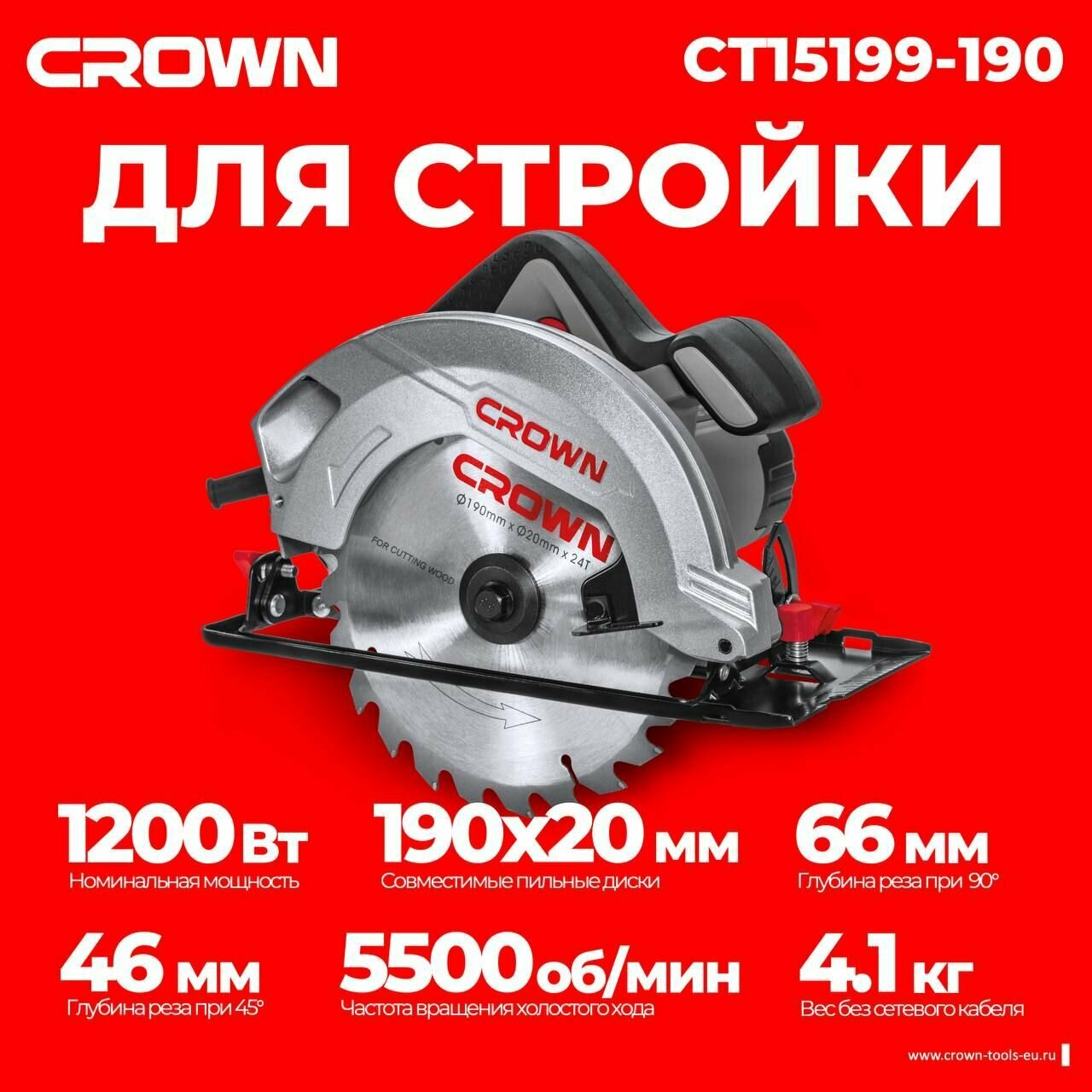 Циркулярная пила дисковая CROWN CT15199-190 (1200Вт, 5500об/мин, диск 190*20*2,0мм, 4,1кг)