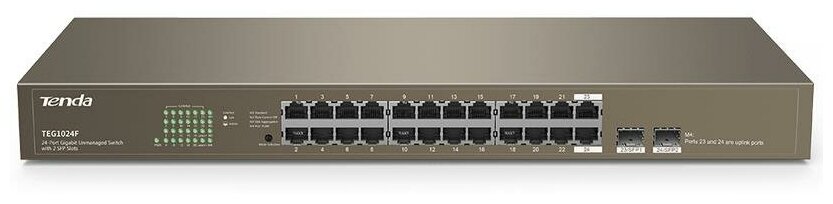 Коммутатор Tenda TEG1024F, 24-портовый неуправляемый гигабитный стоечный , 2 порта SFP, молниезащита 6 кВ