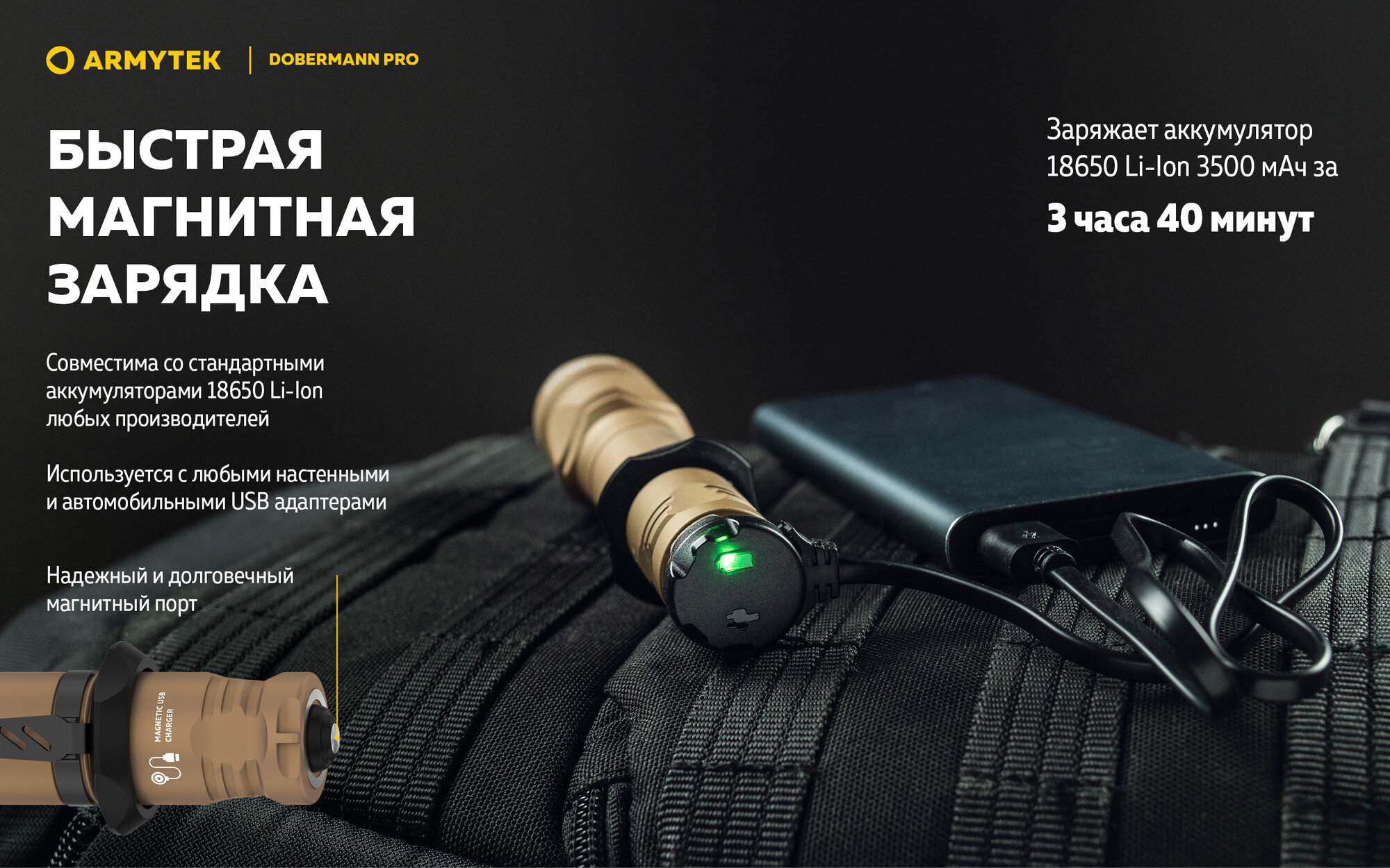 Тактический фонарь ArmyTek Dobermann Pro Magnet USB (белый свет) черный