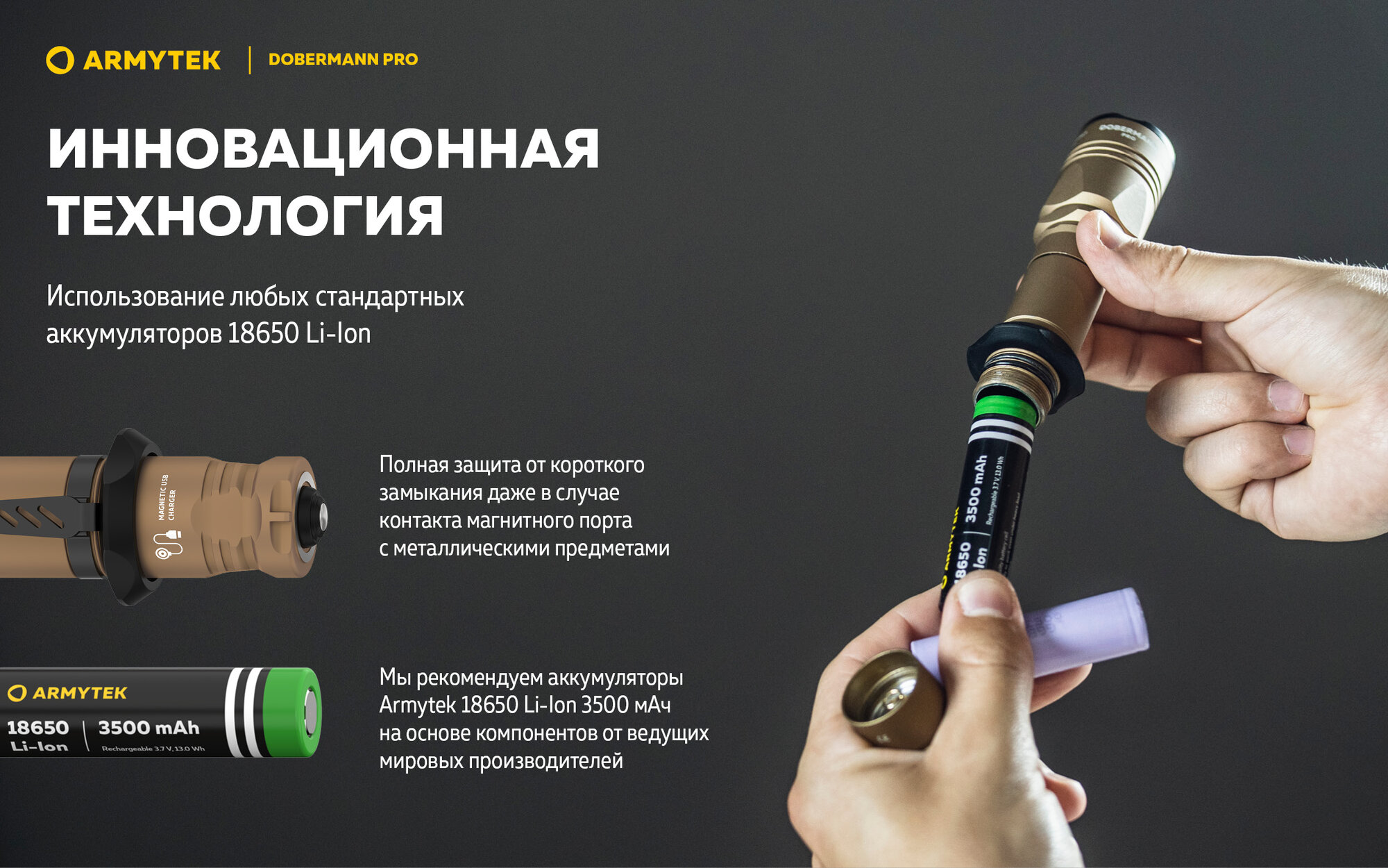 | Дополнительная информация | Быстрая магнитная зарядка: комплектный аккумулятор 18650 Li-Ion 3500 мАч заряжается за 3 ч 40 мин. |