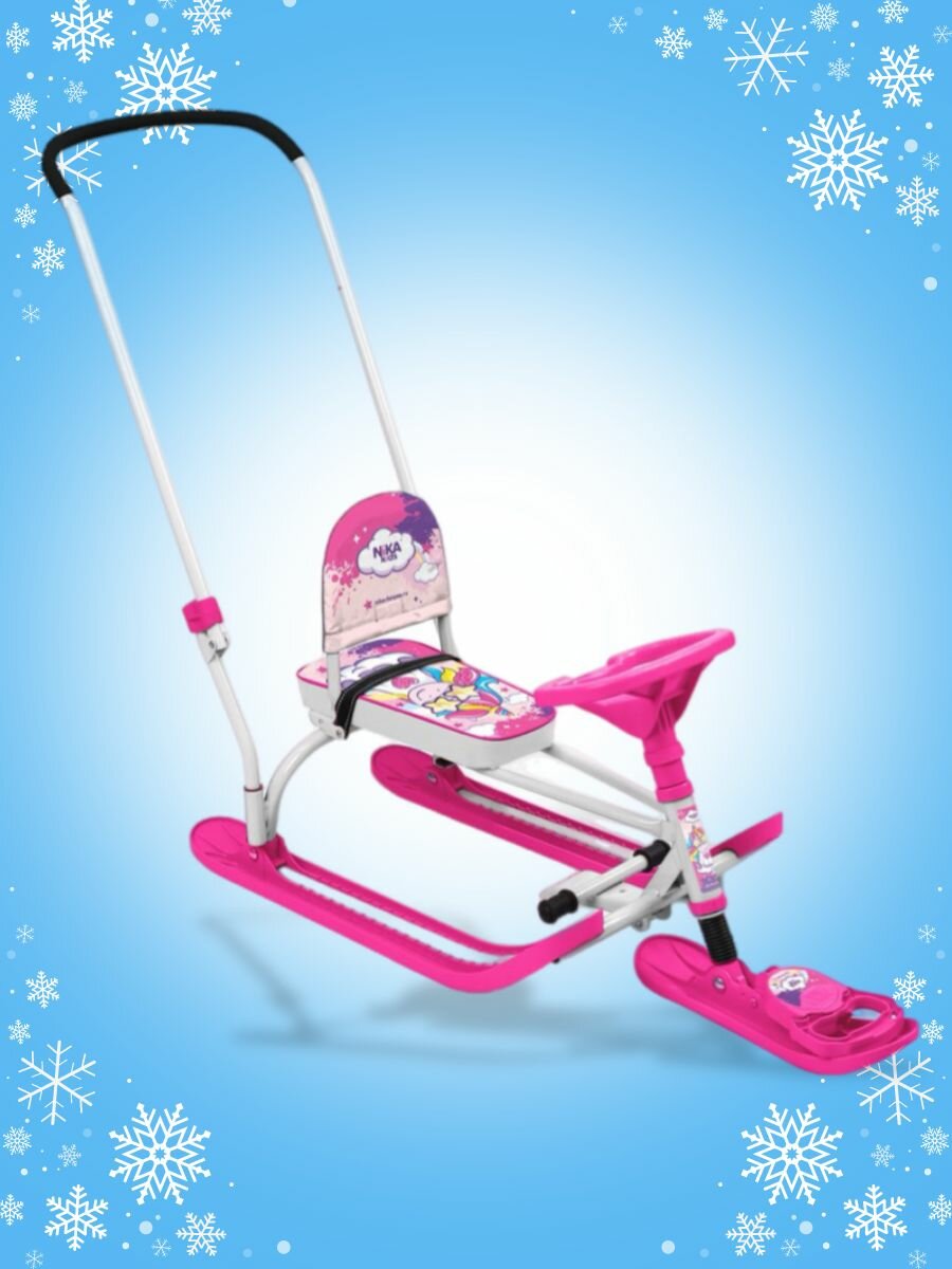 Снегокат Nika Kids TWINY 2 «Единорог», TW2-M/EP, с родительской ручкой, со спинкой и ремнём безопасности, цвет розовый, серый