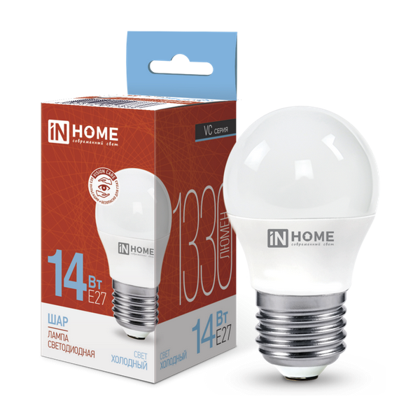 Лампа светодиодная LED-ШАР-VC 14Вт 230В E27 6500К 1330лм, IN HOME 4690612047836 (1 шт.)