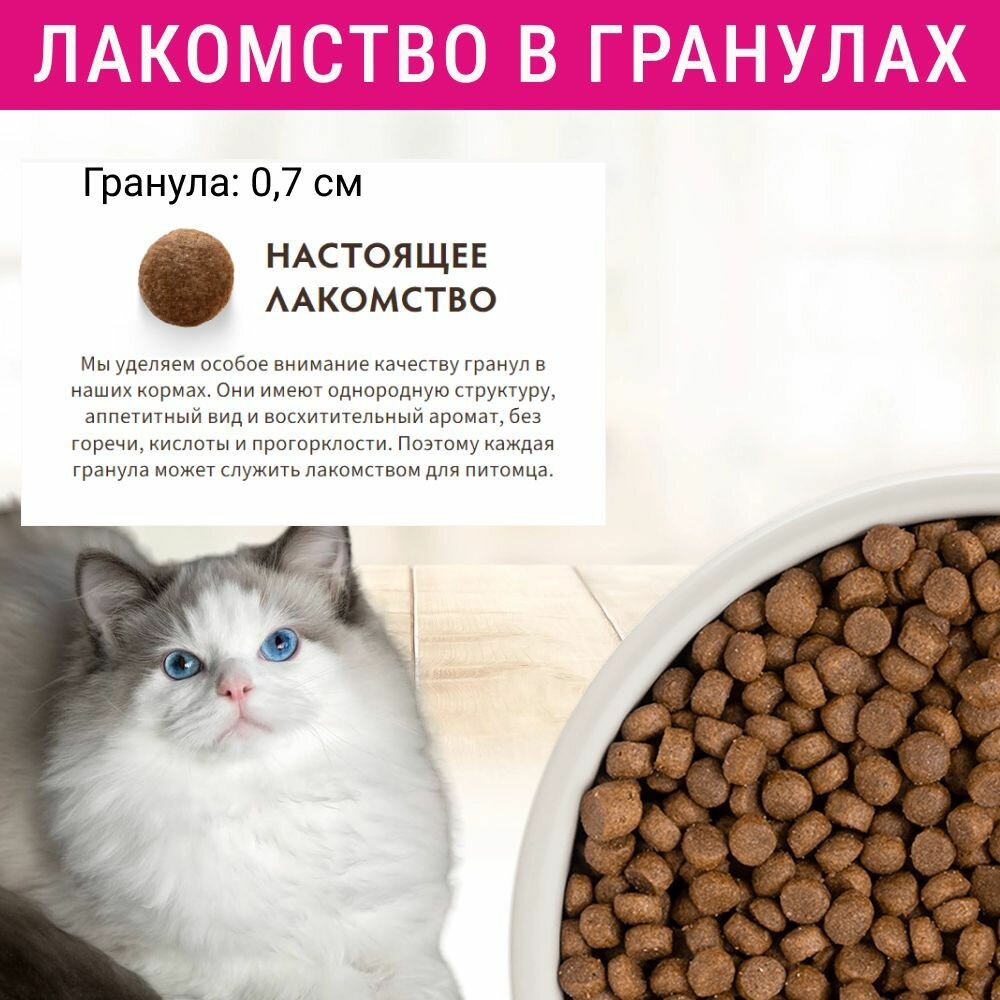 | Плюсы: | Гранулы мелкие, хорошо подходит для взрослых кошек. Кошкам нравиться, кушают без капризов. Особенно для породы Донской сфинкс |