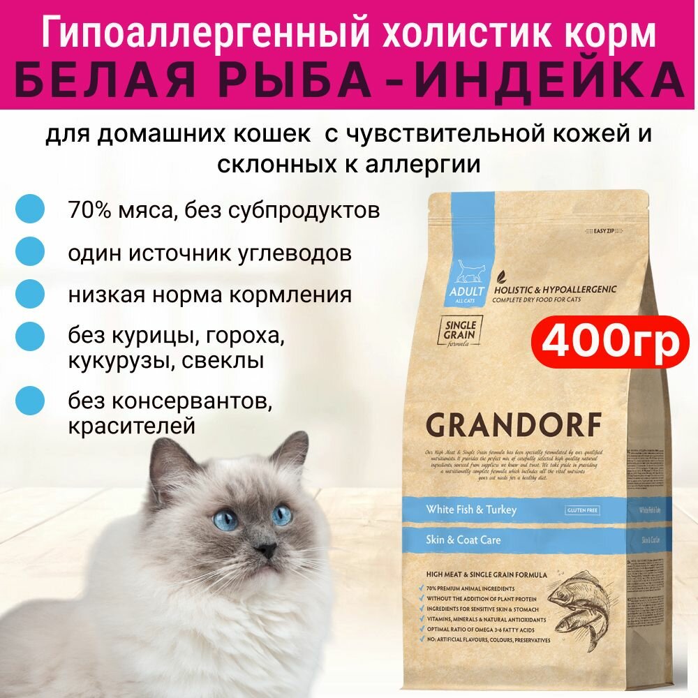 GRANDORF SINGLE GRAIN CAT ADULT SKIN & COAT CARE WHITE FISH & TURKEY низкозерновой для взрослых кошек с чувствительной кожей и шерстью с белой рыбой и индейкой (0,4 кг)