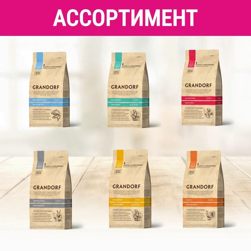 GRANDORF SINGLE GRAIN CAT ADULT SKIN & COAT CARE WHITE FISH & TURKEY низкозерновой для взрослых кошек с чувствительной кожей и шерстью с белой рыбой и индейкой (2 кг)
