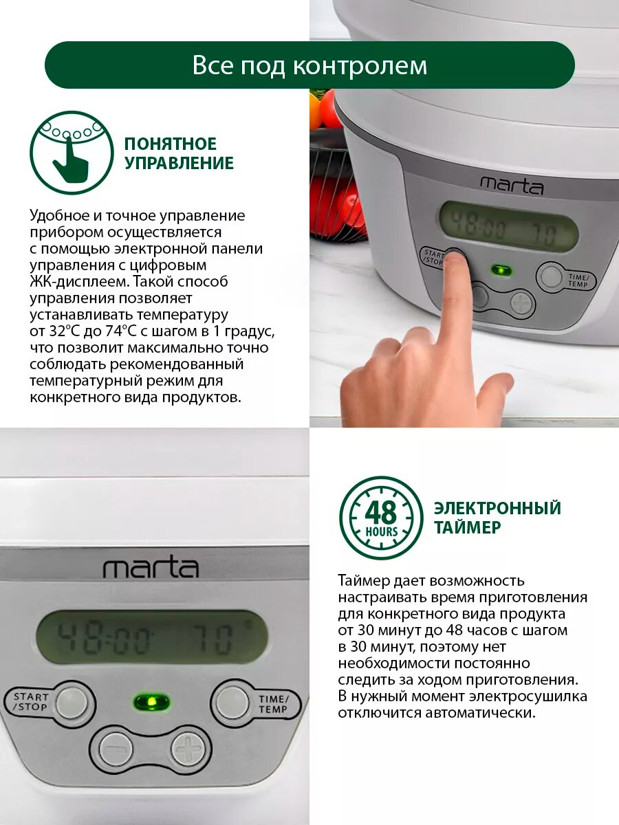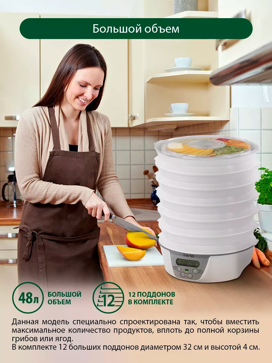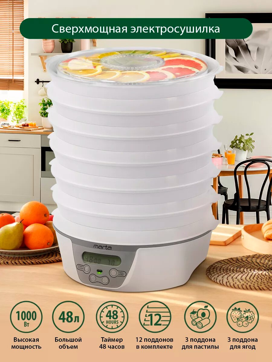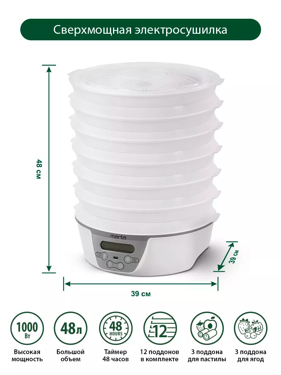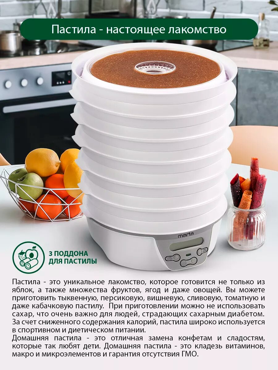 Дегидратор сушилка для овощей электросушилка MARTA MT-FD1888E 18 поддонов (12 основных + 3 для пастилы + 3 для ягод) белый интересное: