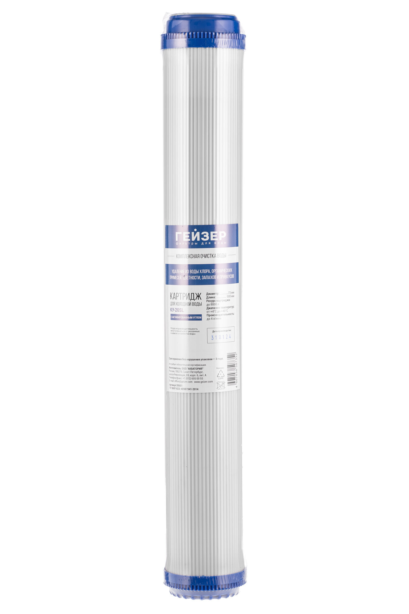 Картридж угольный Гейзер КУ-20SL, удаляет из воды хлор, органические примеси, устраняет неприятный запах и вкус, 30601