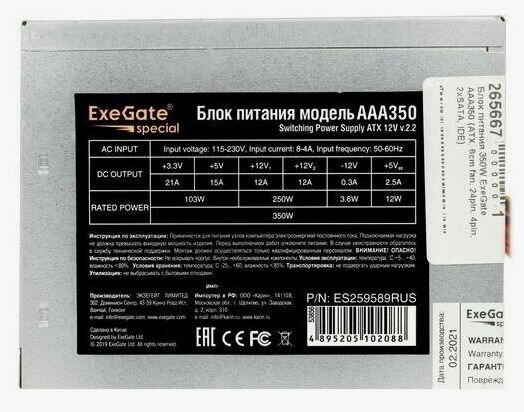 EXEGATE ES259589RUS EX259589 Блок питания 350W AAA350, ATX, 8cm fan, 24p+4p, 2 SATA, 1 IDE