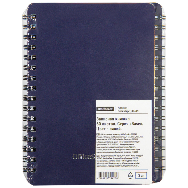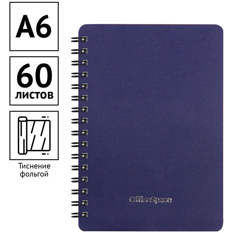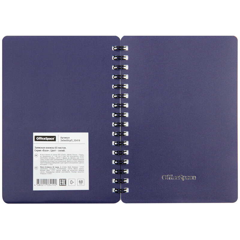 Записная книжка А6 60л. на гребне OfficeSpace "Base", синяя пластиковая обложка 4680211334192