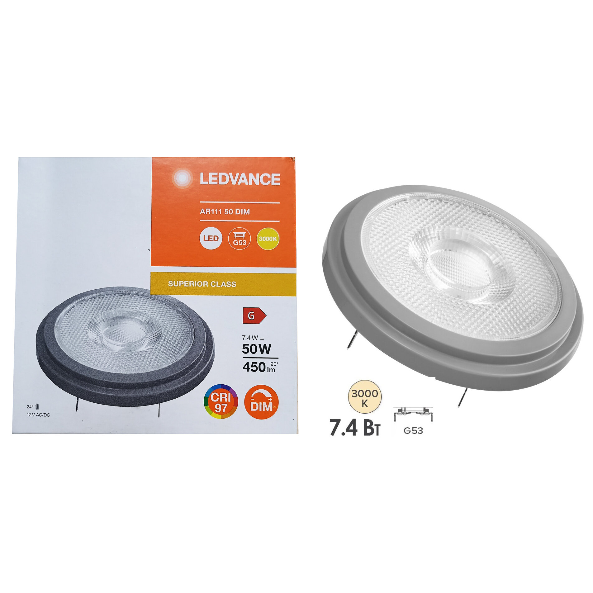 1 шт/уп. Лампа LED Софит AR111 7.4W 12V G53 450Лм D-111mm L-55mm Угол 24 град. Диммируемая 3000К Свет Теплый белый OSRAM, уп. 1шт