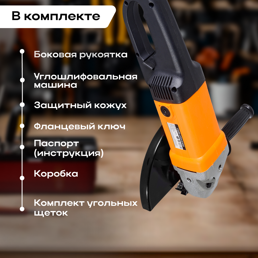 приобретал для собственных нужд около года назад и пользуюсь инструментом по сей день, в комплектацию входят ключ для смены диска, защитный кожух, руководство по эксплуатации и дополнительная рукоятка. В целом отлично шлефует углы, трехпозиционная рукоятка очень помогает в некоторых моментах, удобно!