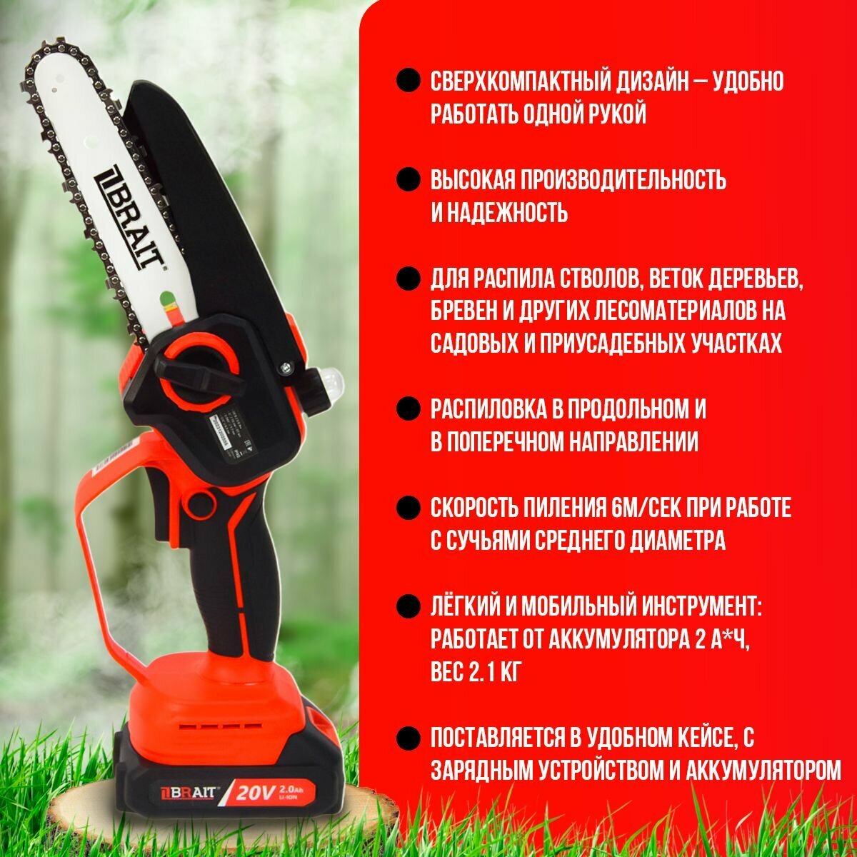 Купить Пила аккумуляторная цепная мини BRAIT BCHS20-2NM, в комплекте АКБ 2Ah (1шт), кейс и зарядка