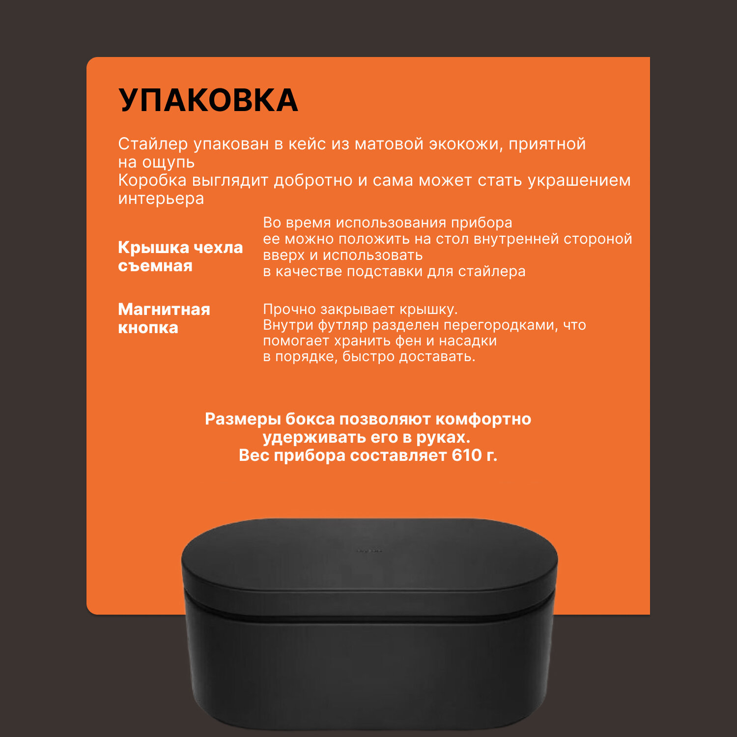 Почему то было 2 коробки - кейс, потом серая коробка с рисунком стайлера (в обзорах ее называют транспортировочной)+ еще одна плотная коробка, обмотанная скотчем яндекса. Возможно в этой версии нет белой коробки с цветными рисунками. Фен дует как боженька, при выключении вибрирует, насадки вставляются идеально. |