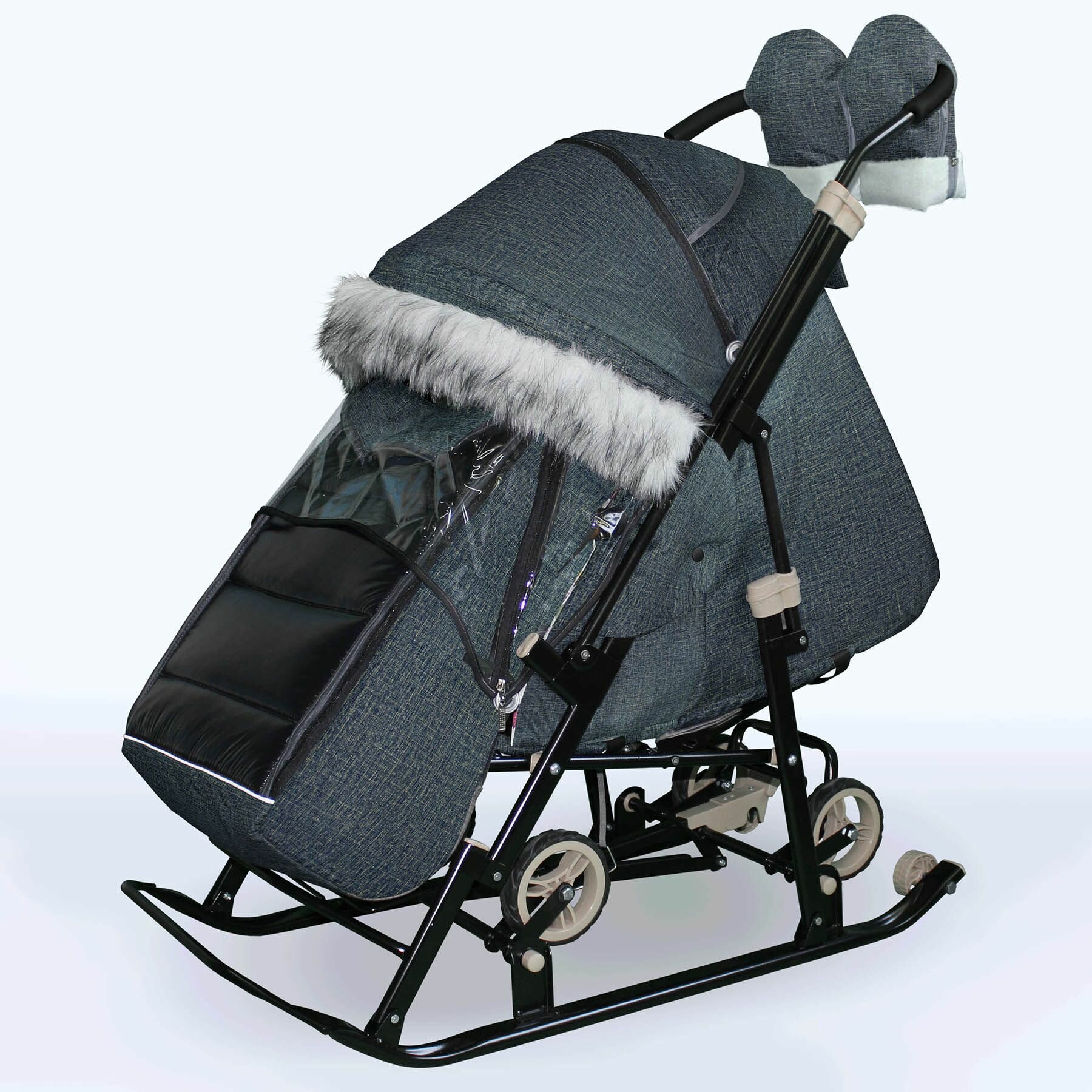 Санки коляска детские зимние Galaxy Glory gloss с колесами и перекидной ручкой, темно-синий лен