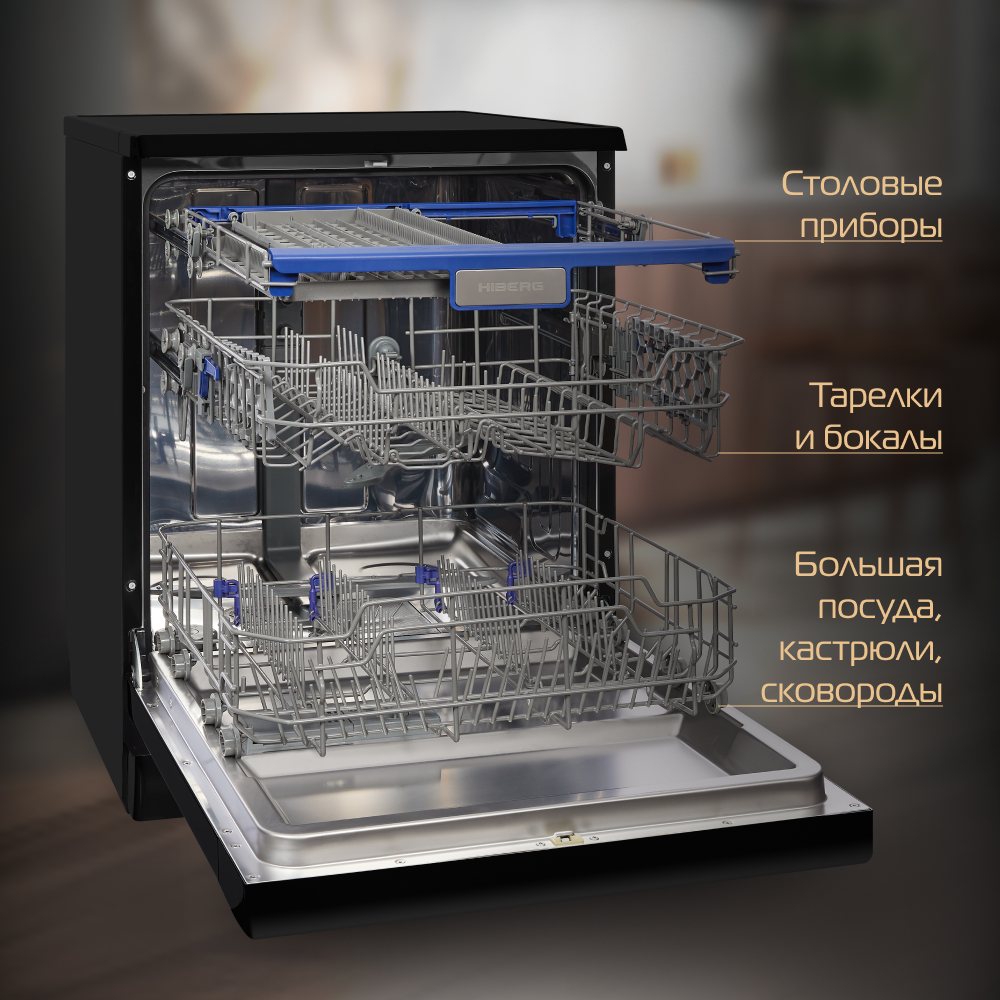 СохранитьПосудомоечная машина "Hiberg" F68 1430 B, отдельностоящая, 14 комплектов, 8 программ, конденсационная сушка, чёрная интересное: