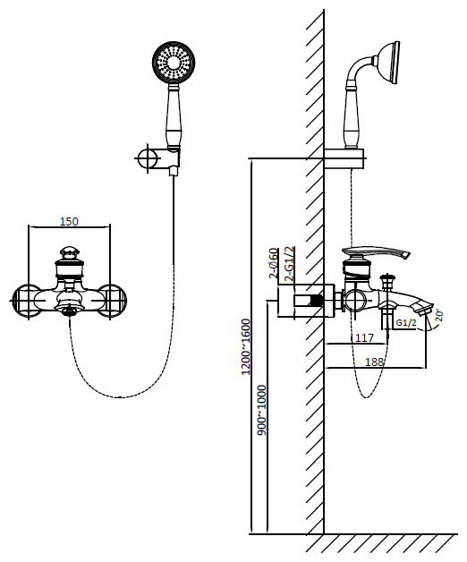 | Комплектация | смеситель настенного монтажа, настенный держатель ручного душа, ручной душ, гибкий металлический шланг, эксцентрики, чаши декоративные |