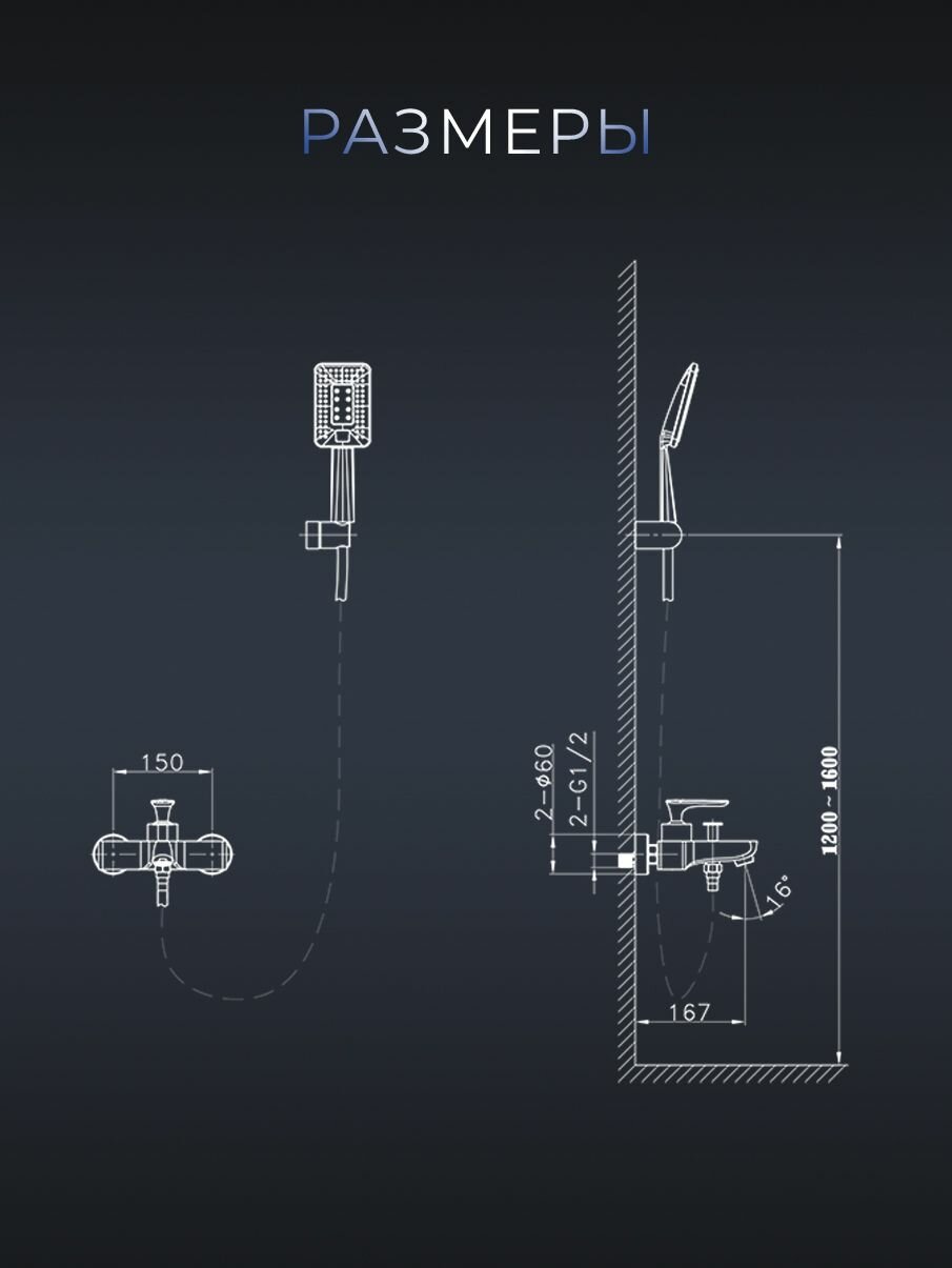 | Комплектация | смеситель настенного монтажа, двухрежимный ручной душ, гибкий полимерный шланг, эксцентрики, чаши декоративные |