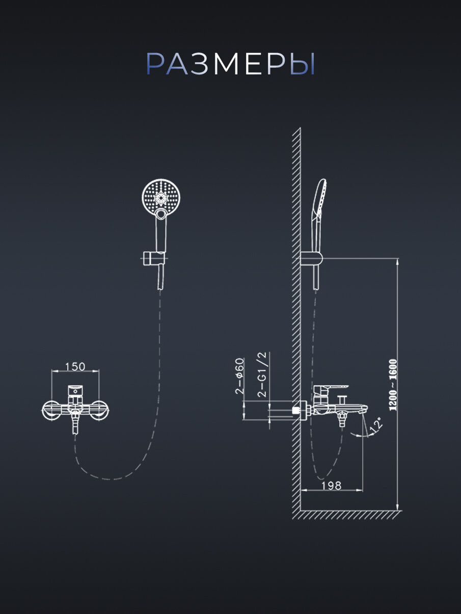 | Комплектация | смеситель настенного монтажа, ручной душ, гибкий полимерный шланг, эксцентрики, чаши декоративная |