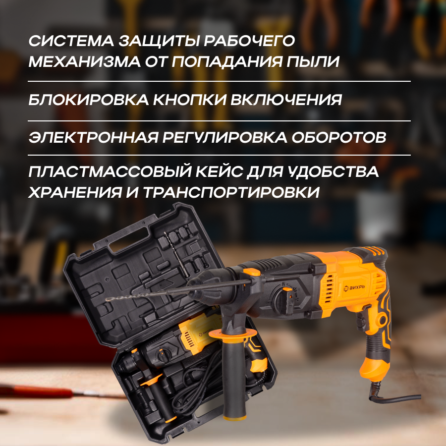 У вихря целая коллекция таких перфораторов, с разными названиями ,но чем они отличаются непонятно, я купил именно эту модель потому что Яндекс указал что здесь быстрая смена патрона ,на самом деле это обман и патрон здесь не меняется. Убогую комплектацию можно объяснить невысокой ценой ,чемодан,упор из дешёвого пластика который ничего не держит ,а гнется,бур шестёрка ,который сломался на 5 секунде работы в кирпиче. Кстати ,защиты от заклинивания бура ,которую указал Яндекс маркет, тоже здесь нет и я его могу удержать бур рукой ,но муфта не срабатывает ,наверное потому что там этой системы просто нет ! Ну а по работе самого перфоратора претензии нет,в кирпич входит как в масло и его надо даже удерживать чтоб получилось аккуратно , не смотря на то что у него всего 1000 ватт я его вполне могу сравнить с бочкой от электроприбора на 1800 вт и весом 6,5 кг ,понятно что вихрь удобнее и реверс хоть и убогий но все таки есть и за месяц работы с ним у меня только положительные эмоции.