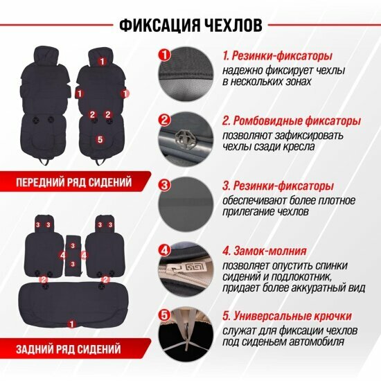 | Подробная комплектация | Чехлы на переднее сиденье со спинкой - 2 шт. Чехлы на заднее сиденье со слитным подголовником (спинка) - 2 шт. Чехлы на заднее сиденье - 1 шт. Подлокотник на молнии для заднего сиденья - 1 шт. Крючки пластик - 2 шт. |