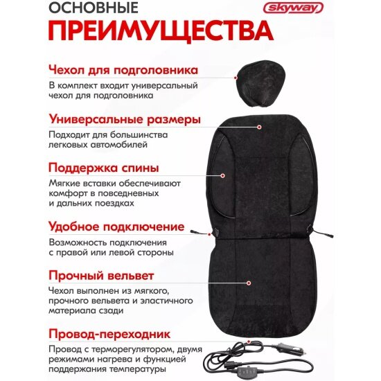 Купить Чехол сиденья с подогревом вельвет ТМ Skyway SKYWAY с терморегулятором (2 режима) Черный с боковой поддержкой спины 12V 116х56см 2,5А-3А (2 шнура: справа, слева)