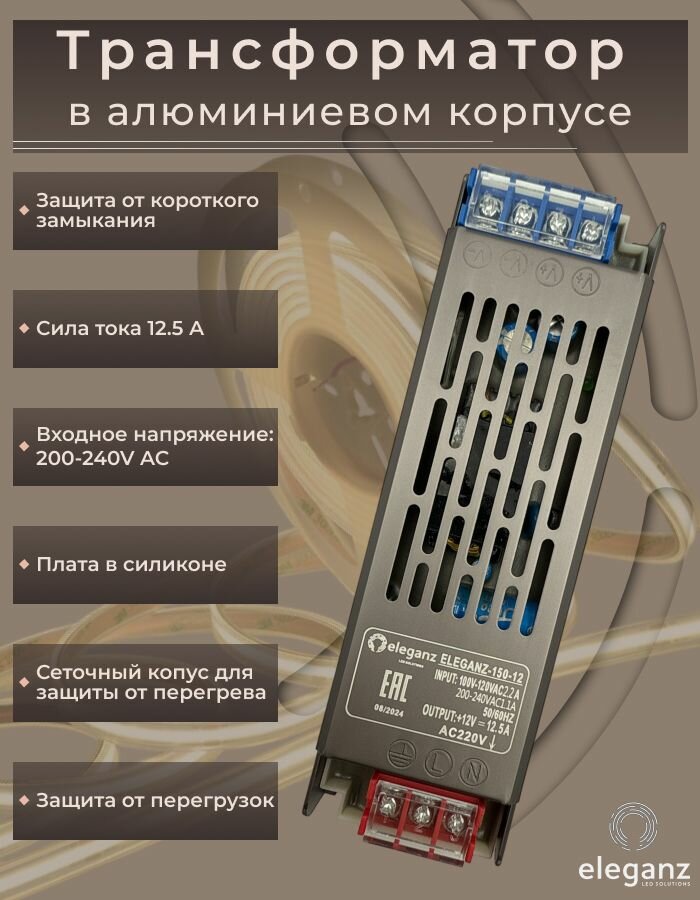 Узкий блок питания/трансформатор "Eleganz 150Вт" для светодиодной ленты 12В IP20