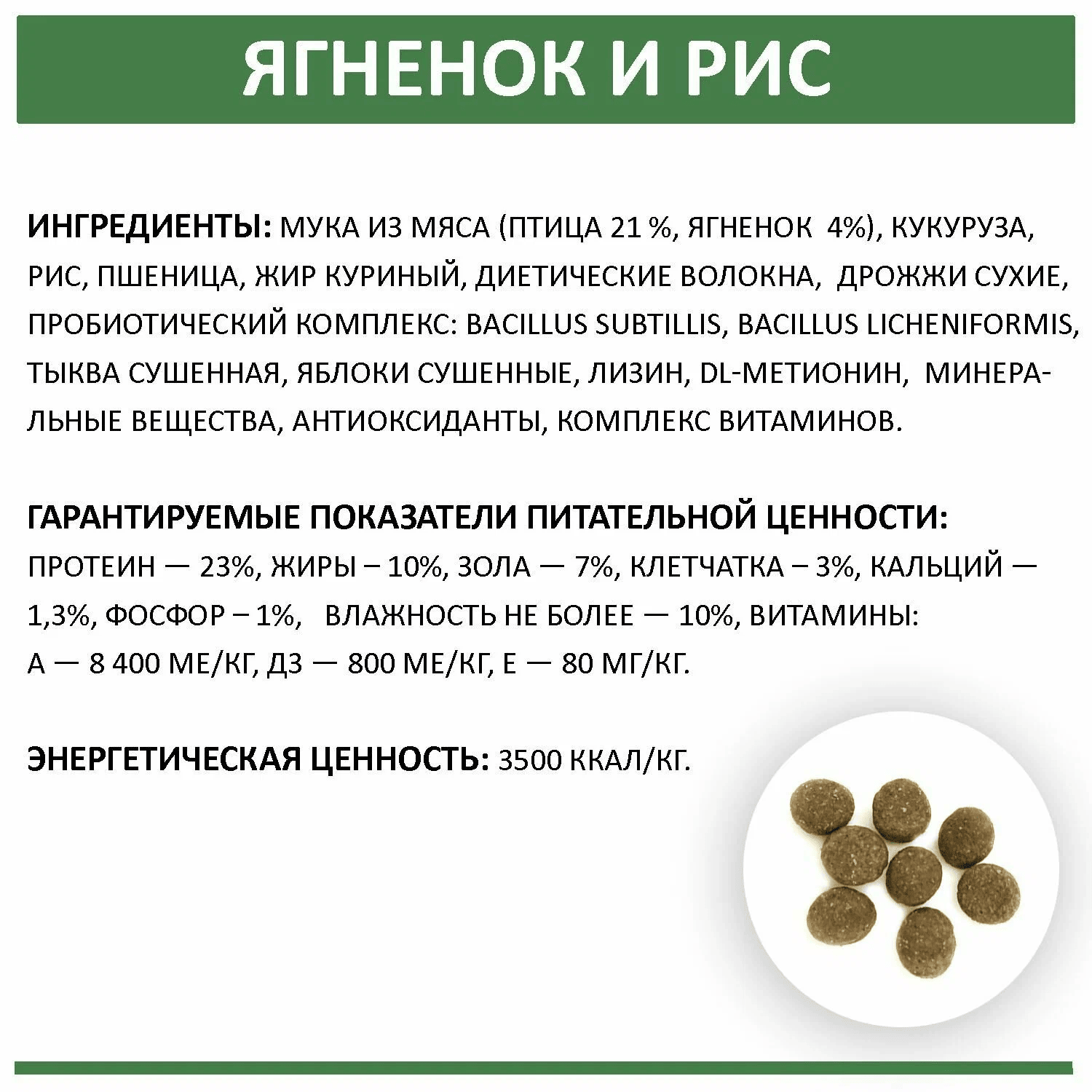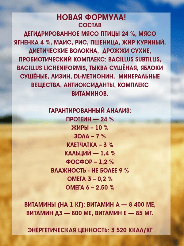 | Состав | мука из мяса (птица 21 %, ягненок 4%,) , кукуруза, рис, пшеница, жир куриный, диетические волокна, дрожжи сухие, пробиотический комплекс: Bacillus subtillis, Bacillus licheniformis, тыква сушенная, яблоки сушенные, лизин, DL-метионин, минеральные вещества, антиоксиданты, комплекс витаминов |