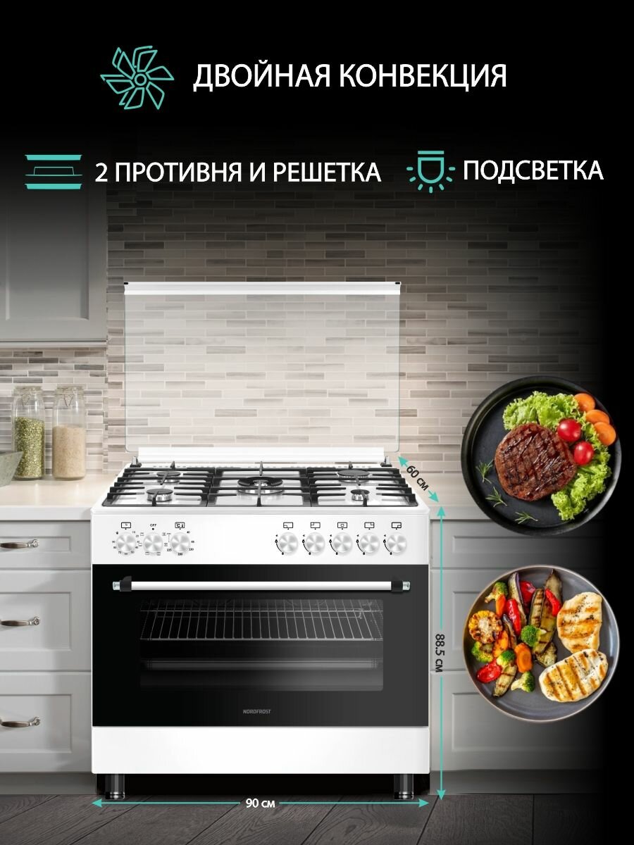 Газоэлектрическая плита NORDFROST GE 9062 W, 110 литров, авторозжиг, конвекция, белое стекло