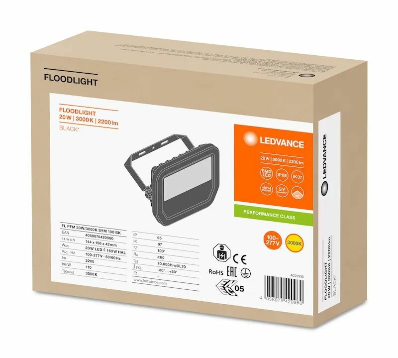Купить Прожектор LED 20W/3000K ( 160W) IP65 2200Lm Свет Теплый белый Симметричный 100 Чёрный LEDVANCE FLOODLIGHT PERFORMANCE, уп. 1шт